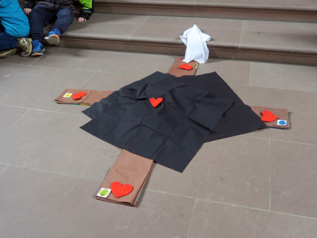 Doch zuvor haben wir – kurz vor den Kar- und Osterfeiertagen den Weg Jesu von Abendmahl und Fußwaschung am Gründonnerstag, über seinen Tod am Kreuz (Karfreitag) bis zur Auferstehung an Ostern in verschiedenen Stationen mit den Kindern erlebt und besprochen. Diesen Weg sind wir als Kreuzweg mit verschiedenen Stationen das erste Mal seit 2019 wieder zusammen mit den Eltern und auch mit unsere Krippen- und Schulkinder gegangen! Das war für alle ein tolles Erlebnis!